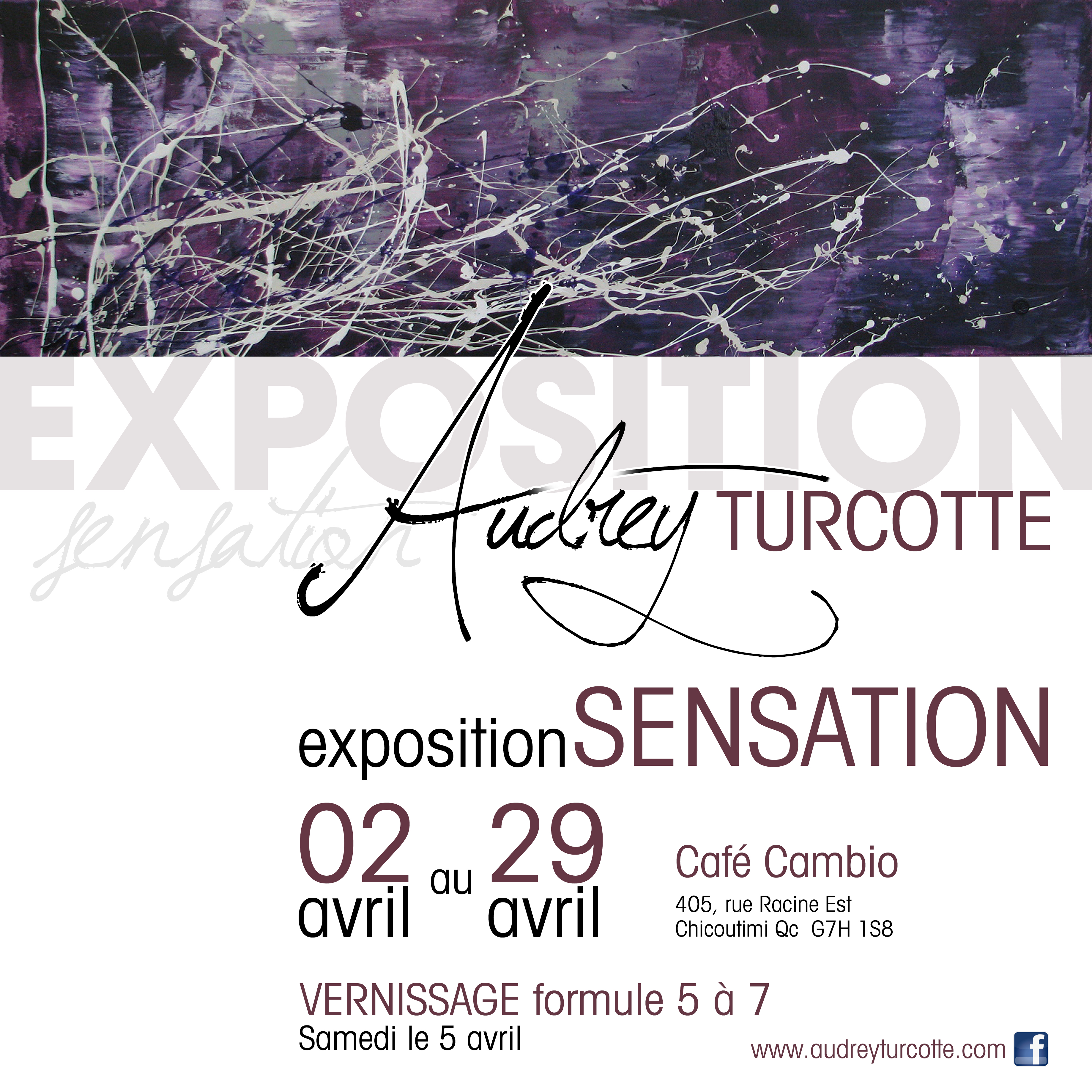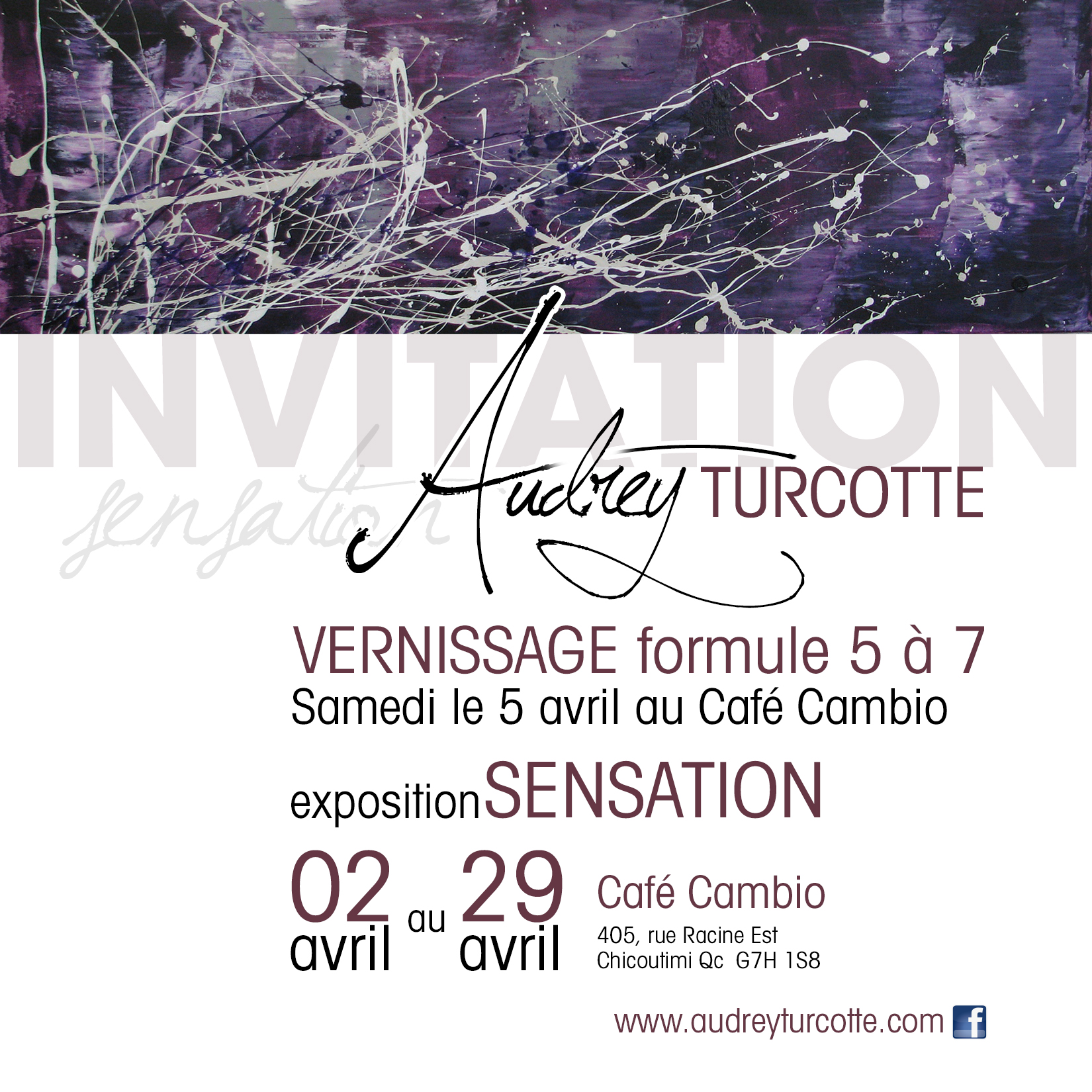 Je fais une exposition solo au Café Cambio sur la rue Racine à Chicoutimi du 2 au 29 avril 2014. Durant cette exposition qui a pour titre SENSATION, vous aurez la chance de découvrir des œuvres de grands formats réalisées en 2014. Je serais présente lors du vernissage samedi 5 avril dès 17H, pour une soirée formule 5 à 7. Bienvenue à tous.